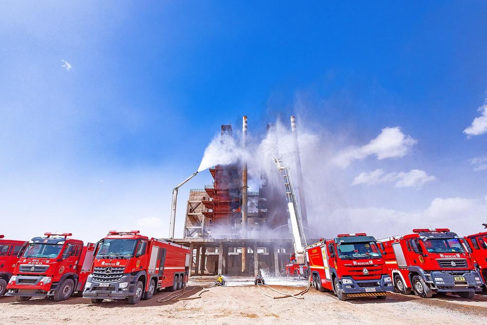 在“次生災(zāi)害滅火救援”科目現(xiàn)場(chǎng),化工園區(qū)內(nèi)的熊熊烈焰映紅了半邊天。消防員身著隔熱服操控滅火機(jī)器人抵近火源,高噴車噴射出的泡沫如瀑布般覆蓋燃燒裝置,移動(dòng)炮陣列織就立體火網(wǎng)。從突破火線到追殲火頭,從清理余火到看守火場(chǎng),救援人員輪替堅(jiān)守在一線,成功阻止火勢(shì)的蔓延。