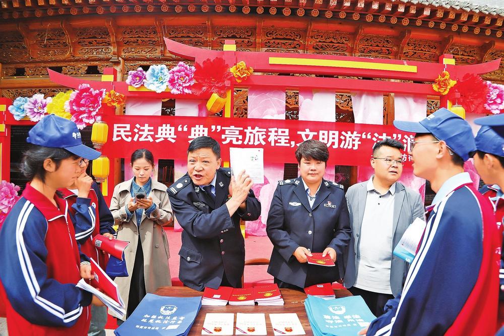 工作人員宣講民法典知識(shí)。5月11日,臨夏市司法局八坊司法所在蓋碗茶廣場開展民法典主題宣傳活動(dòng)。新甘肅·甘肅法治報(bào)記者陳孝志攝