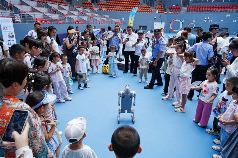 緊接著,在網(wǎng)球館前,大家首先被特警隊員精彩的防暴小隊?wèi)?zhàn)術(shù)演練所震撼,矯健的身手贏得了陣陣掌聲。警犬迅猛精準(zhǔn)的撲咬展示更是讓小朋友們連連叫好。警用機器狗的靈活表演引得大家紛紛上前互動,最讓小朋友們躍躍欲試的還是無人機穿梭器的體驗環(huán)節(jié),戴上眼鏡感受著穿梭器的“速度與激情”,孩子們臉上洋溢著喜悅和興奮,近距離感受到了科技在公安工作中的強大應(yīng)用。