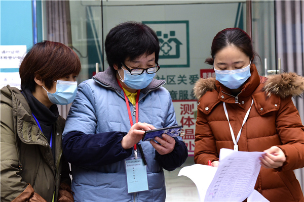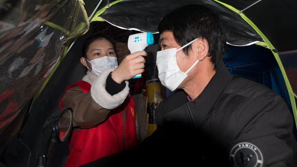 自疫情防控工作開展以來,湖北省咸寧市咸安區(qū)紀(jì)委監(jiān)委90后干部黃煬,始終堅守防疫一線,參與卡點值守、入戶摸排、生活物資代購等工作,耐心安撫居民情緒,為他們進(jìn)行心理疏導(dǎo)。圖為黃煬為夜歸的居民測量體溫。(湖北省咸寧市咸安區(qū)紀(jì)委監(jiān)委 魯一凡 攝)