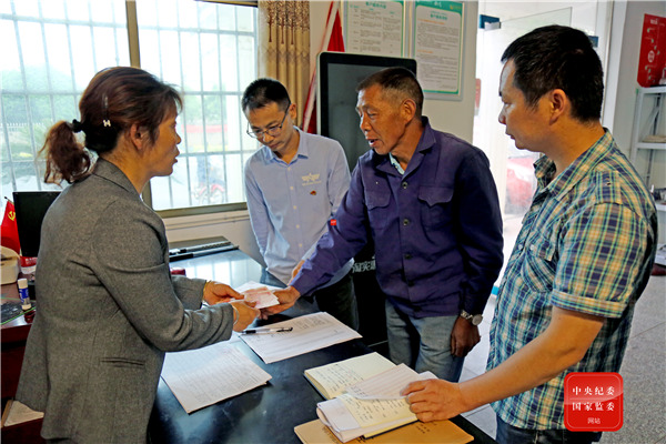湖南省益陽市資陽區(qū)長春鎮(zhèn)幸福村村級義務(wù)監(jiān)督員主動履職,全程參與并監(jiān)督發(fā)放產(chǎn)業(yè)扶貧分紅資金,確保每一筆民生資金落到實處。(湖南省益陽市資陽區(qū)紀(jì)委監(jiān)委 張偉敏 攝)