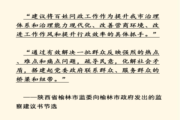 2019年12月6日,榆林市監(jiān)委制發(fā)的《關(guān)于解決百姓問政工作中存在問題的建議》的監(jiān)察建議書送達榆林市政府,并交于市長本人。