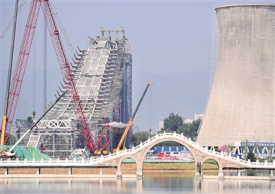 北京冬奧組委踐行節(jié)儉辦奧運(yùn),對(duì)首鋼老工業(yè)園區(qū)再利用,建成滑雪大跳臺(tái)等競(jìng)賽場(chǎng)館?;┐筇_(tái)是冬奧歷史上第一座與工業(yè)遺產(chǎn)再利用直接結(jié)合的競(jìng)賽場(chǎng)館。圖為2019年7月工人在改造滑雪大跳臺(tái)。新華社記者 張晨霖 攝