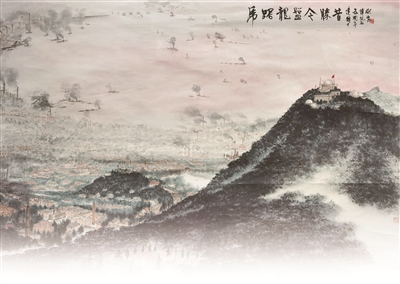1949年4月23日,人民解放軍占領(lǐng)南京。毛澤東聞?dòng)嵑?,欣然寫下這首詩(shī),描寫了人民解放軍橫渡長(zhǎng)江、解放南京的雄偉壯闊、氣勢(shì)磅礴場(chǎng)面。在畫作中,畫家描繪的是南京城的壯麗景色,沐浴在朝暉之中的紫金山及其周圍景致,以浪漫的詩(shī)意呈現(xiàn)出來(lái)。近處,紫金山巍峨高聳,天文臺(tái)亦清晰可見(jiàn);中景,江上輪渡往來(lái),兩岸工廠林立,煙霧繚繞;遠(yuǎn)處,紅霞爛漫,水天一色。新中國(guó)成立后的南京繁忙而祥和,墨色淋漓間,新中國(guó)欣欣向榮的景象躍然紙上。