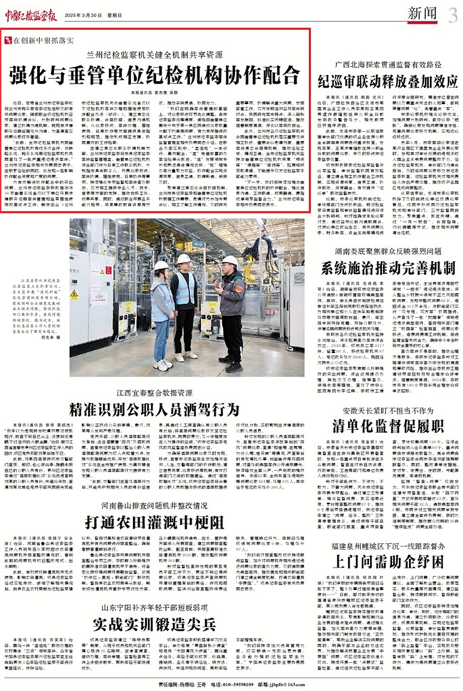 在建立常態(tài)化聯(lián)系協(xié)調(diào)機制方面,蘭州市紀委監(jiān)委將市縣紀委監(jiān)委案件監(jiān)督管理室、垂管單位紀檢機構(gòu)綜合部門作為日常工作聯(lián)系機構(gòu),分別指定具體聯(lián)系人,負責(zé)線索移送、案件協(xié)調(diào)、措施使用、日常協(xié)作等事項,持續(xù)強化專項監(jiān)督和案件查辦聯(lián)動,雙方相互提供專業(yè)人才、技術(shù)、信息等方面的支持,推動優(yōu)勢互補、成果共享。同時,通過聯(lián)合開展業(yè)務(wù)能力培養(yǎng)、共享廉政教育資源等方式,推動條塊貫通,協(xié)同發(fā)力。