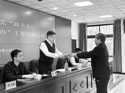 圖為河南省安陽市紀委監(jiān)委向派駐市水利局紀檢監(jiān)察組遞交2025年度全面從嚴治黨監(jiān)督責任清單,持續(xù)推動“兩個責任”走深走實。王小山 攝