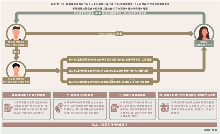 貪污罪。2017年10月,林某某妻子陶某某(無業(yè),另案處理)考慮到自己以個人身份繳納社保已滿15年,而按照規(guī)定,個人參保在55歲才能領(lǐng)取養(yǎng)老金,于是便想掛靠企業(yè)單位參保,以便能在50歲辦理退休、提前享受退休待遇?;诖耍漳衬潮闩c林某某商量能否掛靠B縣農(nóng)業(yè)開發(fā)公司提前辦理退休,林某某聽后表示同意,并利用擔(dān)任該公司董事長的職務(wù)便利,在明知陶某某不符合提前退休條件的情況下,安排時任公司辦公室主任李某某(另案處理)虛構(gòu)勞動關(guān)系,為陶某某以該公司職工身份辦理退休事宜。手續(xù)辦理過程中,李某某按林某某的安排,偽造B縣農(nóng)業(yè)開發(fā)公司與陶某某的《勞動合同書》,經(jīng)林某某本人簽字后加蓋公司合同專用章,陶某某憑該合同在B縣人力資源和社會保障局進(jìn)行勞動合同鑒證。完成鑒證后,陶某某順利以B縣農(nóng)業(yè)開發(fā)公司職工身份參保,當(dāng)年度公司為其繳納職工養(yǎng)老保險、工傷保險、失業(yè)保險、醫(yī)療保險共計7649.76元。其間,陶某某從未在B縣農(nóng)業(yè)開發(fā)公司上班,也未向公司補(bǔ)繳為其繳納的社保費用。