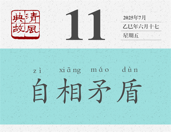 “自相矛盾”的本義是,不管是自己的矛刺穿了自己的盾,還是自己的盾無法被自己的矛刺穿,都會陷入不能自圓其說的難堪境地。后人則以“自相矛盾”為典,比喻一個人前面說的和后面說的、前面做的和后面做的相互抵觸,或者自己所說與所做、自己所為與所述互相沖突。也指同一機關、同一機構中各個部門、各個成員之間說法不統(tǒng)一,行為不一致。宋人王觀國《學林·言行》:“圣賢言行,要當顧踐,毋使自相矛盾。”