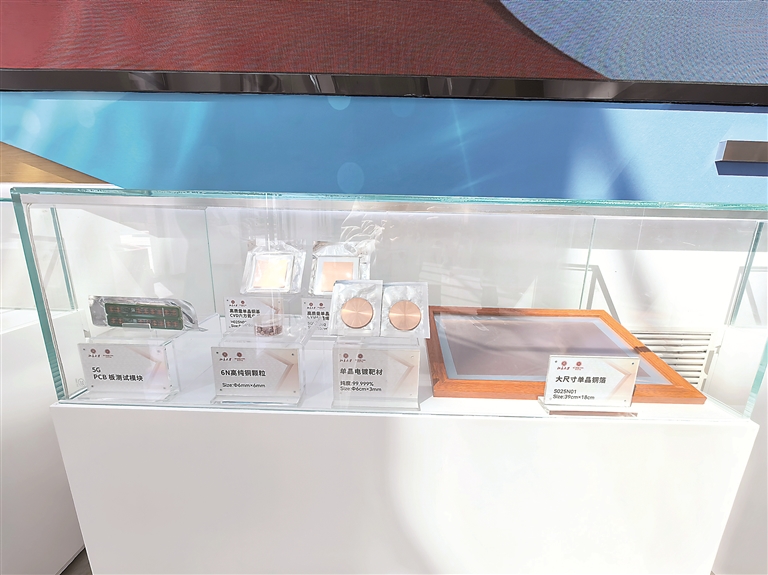 在懷柔科學城的核心區(qū)域,坐落著占地面積12.6畝的輕元素量子材料交叉平臺。走進大廳,玻璃展示柜中擺放著銅基石墨烯復合線、大尺寸單晶銅箔、6N高純銅顆粒等一系列尖端材料。其中,一款圓形透明的12英寸單層二硫化鉬薄膜格外引人注目,平臺工作人員王異楠告訴記者,這是現(xiàn)有技術下能做出的直徑最大的單層二硫化鉬薄膜,主要應用在激光器領域。
