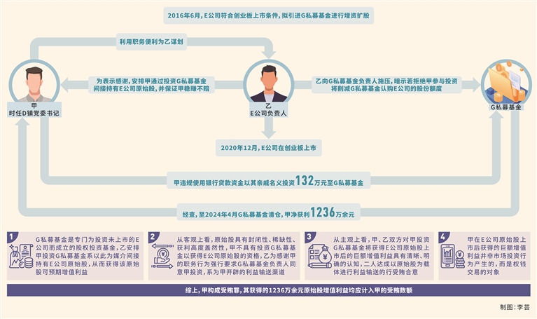 其中,2016年6月,E公司符合創(chuàng)業(yè)板上市條件,擬引進(jìn)G私募基金和H私募基金進(jìn)行增資擴(kuò)股。乙為感謝甲在企業(yè)用地審批等方面提供的幫助,提議安排甲通過(guò)投資G私募基金(該基金是專門(mén)為投資未上市的E公司而成立的股權(quán)投資基金,按照每股5.5元的價(jià)格取得E公司股本600萬(wàn)股,并辦理相應(yīng)的變更登記手續(xù))間接持有E公司原始股,并告知甲E公司擬上市情況以及其會(huì)與G私募基金簽訂對(duì)賭協(xié)議(若E公司未實(shí)現(xiàn)上市,G私募基金有權(quán)要求乙原價(jià)回購(gòu),并按照年利率10%支付補(bǔ)償款),甲無(wú)需承擔(dān)市場(chǎng)風(fēng)險(xiǎn),穩(wěn)賺不賠,甲表示同意。此后,乙向G私募基金負(fù)責(zé)人施壓,暗示若拒絕甲參與投資將削減G私募基金認(rèn)購(gòu)E公司的股份額度,并將該額度交由其競(jìng)爭(zhēng)對(duì)手H私募基金認(rèn)購(gòu)。隨后,甲違規(guī)使用銀行貸款資金以其親戚名義投資132萬(wàn)元至G私募基金(根據(jù)相關(guān)規(guī)定,私募基金投資者應(yīng)當(dāng)具備相應(yīng)資金實(shí)力,不得用貸款資金從事股本權(quán)益性投資,甲的行為不符合規(guī)定)。2019年6月,I私募基金以每股11.52元溢價(jià)收購(gòu)G私募基金持有的部分E公司股份。2020年12月,E公司在創(chuàng)業(yè)板上市。經(jīng)查,至2024年4月G私募基金清倉(cāng),甲凈獲利1236萬(wàn)余元。