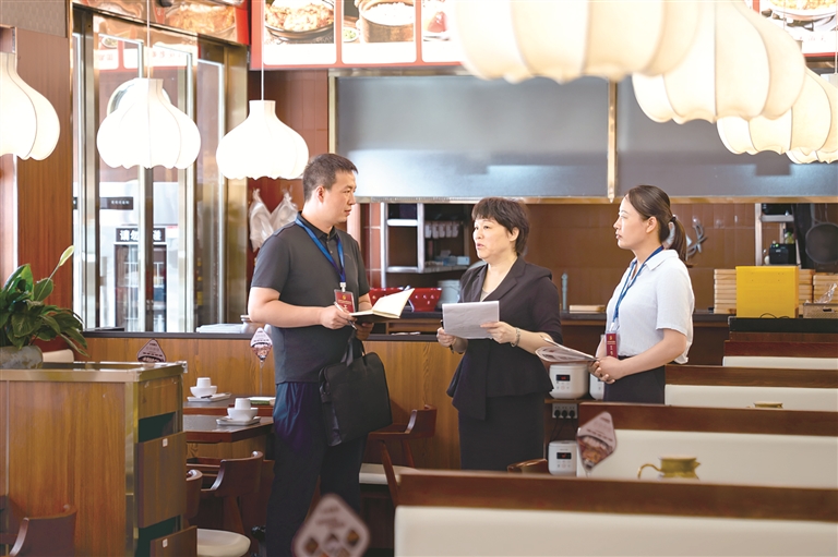 河南省漯河市郾城區(qū)紀(jì)委監(jiān)委圍繞公款吃喝、違規(guī)接受管理服務(wù)對象宴請等違反中央八項規(guī)定精神問題開展監(jiān)督檢查,一嚴(yán)到底狠剎歪風(fēng)邪氣。圖為近日,該區(qū)紀(jì)檢監(jiān)察干部在轄區(qū)某飯店了解相關(guān)情況。王曉 攝