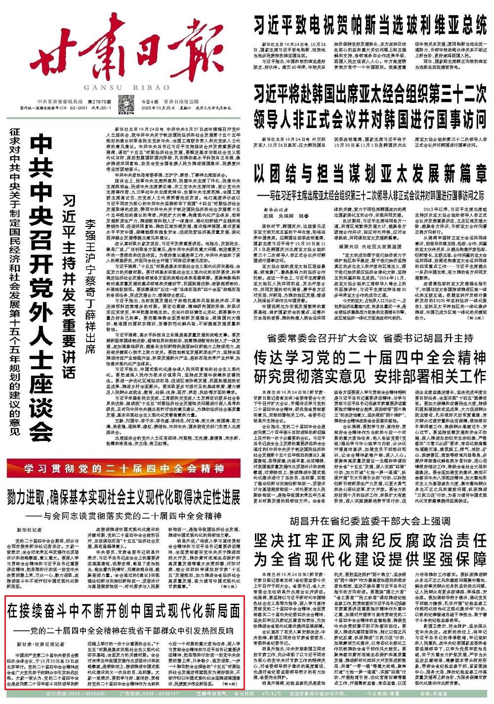 《甘肅日?qǐng)?bào)》2025年10月25日 第1版