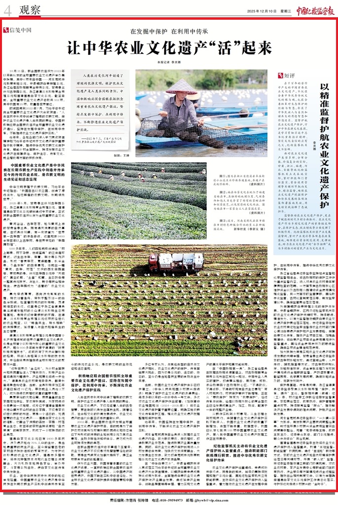 農業(yè)文化遺產保護任重道遠。申遺成功并非終點,而是新的起點,后續(xù)仍需持續(xù)挖掘和推廣系統(tǒng)價值。屬地紀檢監(jiān)察機關立足職能職責,主動將農業(yè)文化遺產保護納入監(jiān)督重點,著力推動農業(yè)文化遺產在發(fā)掘中保護、在利用中傳承,推進中華優(yōu)秀農耕文化保護傳承。