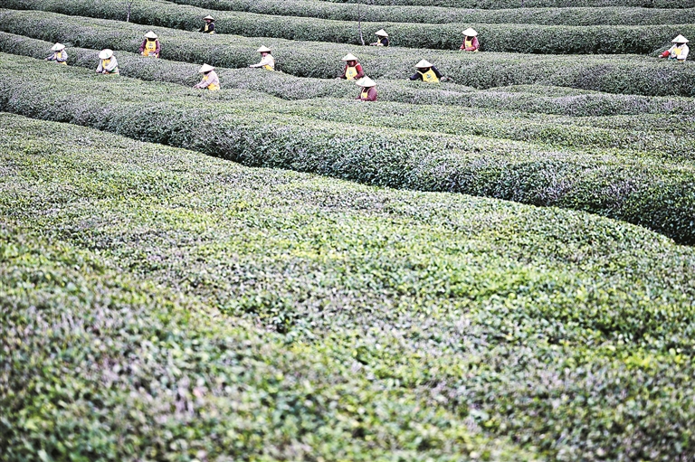 圖②:福鼎白茶文化系統(tǒng)位于福建省福鼎市,其獨特的地理位置、氣候條件和悠久歷史孕育了特有的茶樹品種和制茶技藝,以及深厚的文化內涵。圖為福鼎市一家茶企工人在茶園采茶。(資料圖片)