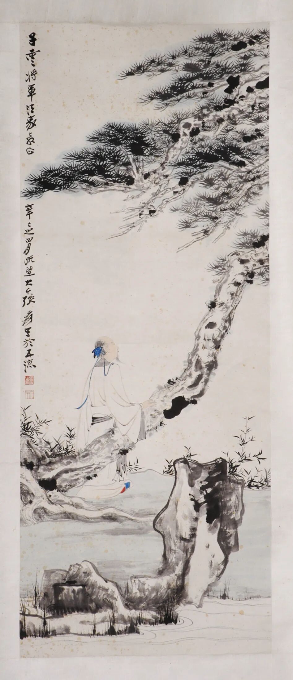 在松與士的意象組合上,張大千運(yùn)用“攢針”與“點(diǎn)簇”相結(jié)合的技法,通過(guò)墨色濃淡變化,既表現(xiàn)松針的茂密層次,又展現(xiàn)枝干的虬曲質(zhì)感。高士形象以簡(jiǎn)練而富有彈性的線條勾勒,衣紋處理融匯了唐代吳道子“吳帶當(dāng)風(fēng)”的飄逸與宋代李公麟“鐵線描”的勁挺,更注入張大千自創(chuàng)的雄渾筆性。人物神情安詳,目視遠(yuǎn)方,與蒼松形成虛實(shí)相生的藝術(shù)效果。