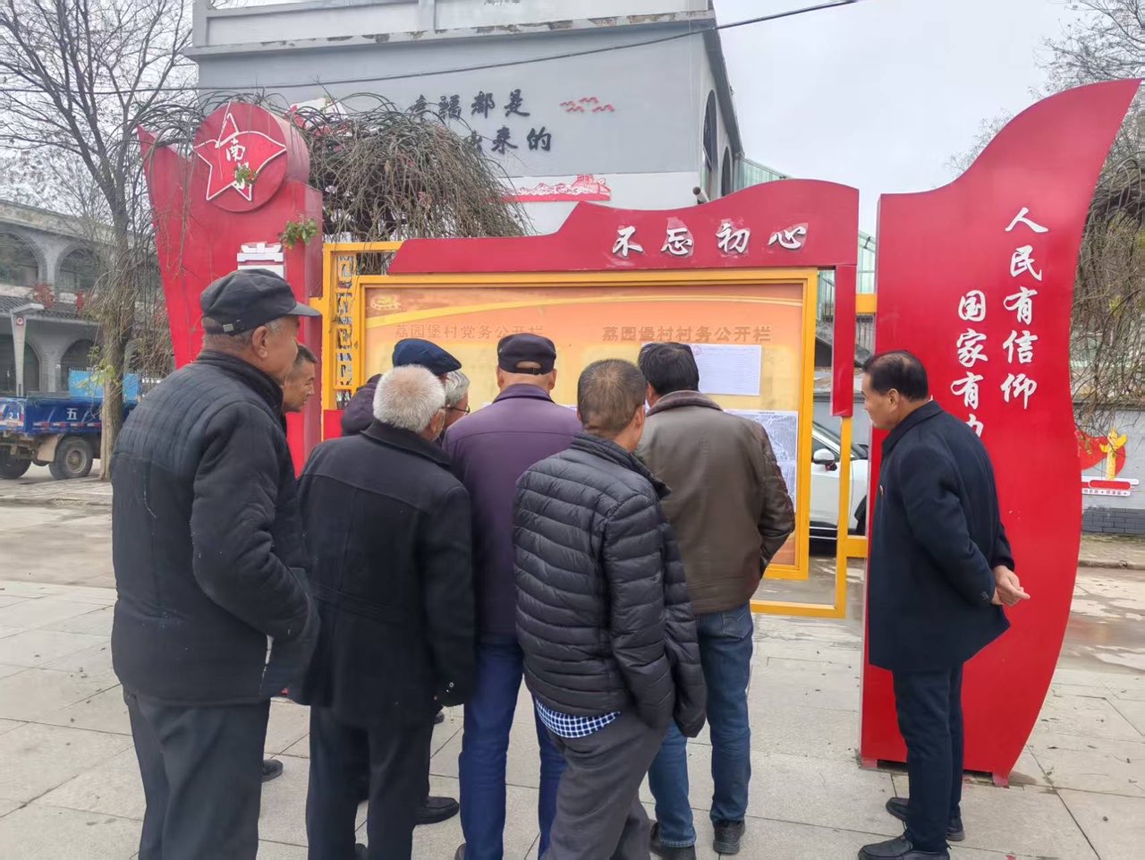 2025年11月20日,村民在南梁鎮(zhèn)荔園堡村村務(wù)公開欄前查看村級財(cái)務(wù)收支情況。