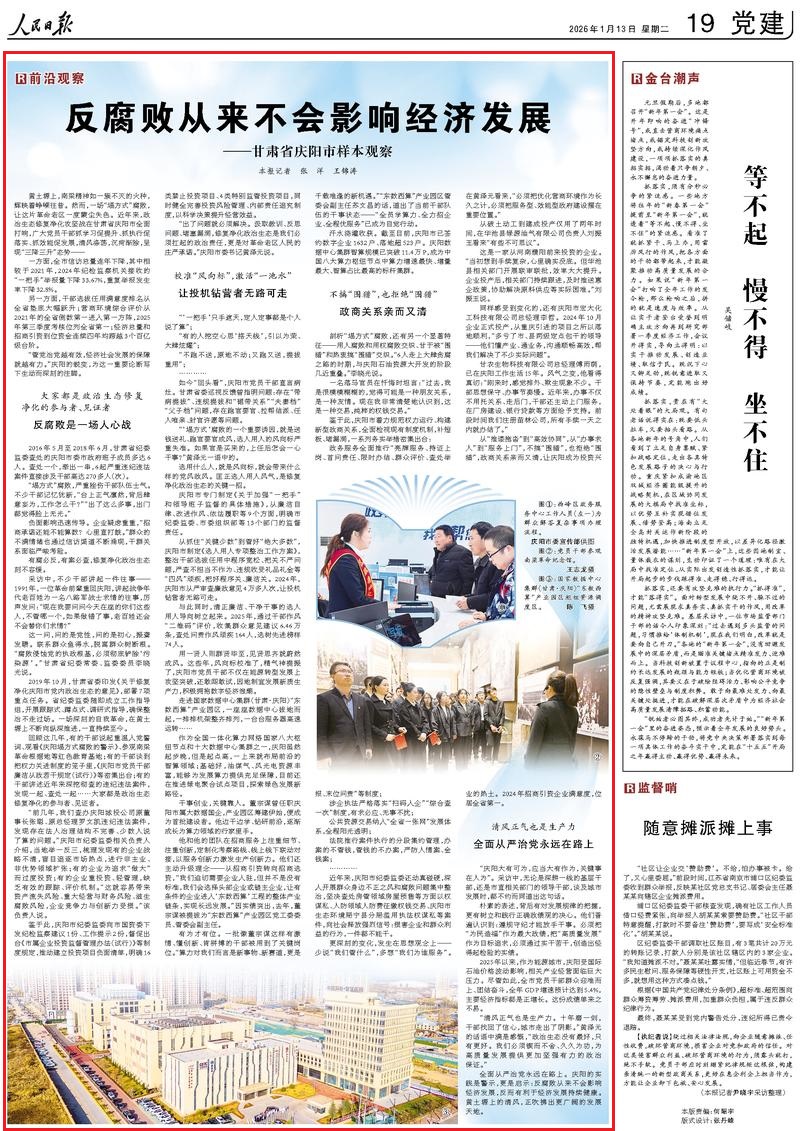 全面從嚴治黨永遠在路上。慶陽的實踐是警示,更是啟示:反腐敗從來不會影響經(jīng)濟發(fā)展,反而有利于經(jīng)濟發(fā)展持續(xù)健康。黃土塬上的清風,正吹拂出更廣闊的發(fā)展天地。(記者 張洋 王錦濤)