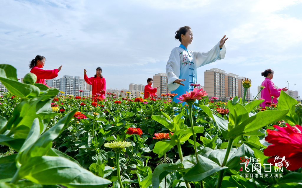 7月8日清晨,甘肅張掖甘州區(qū)順祥名苑小區(qū)南側的123畝裸露土地綠化美化點上,各種鮮花競相綻放,花香四溢,綠意盎然,太極拳練習愛好者正在練習太極拳。