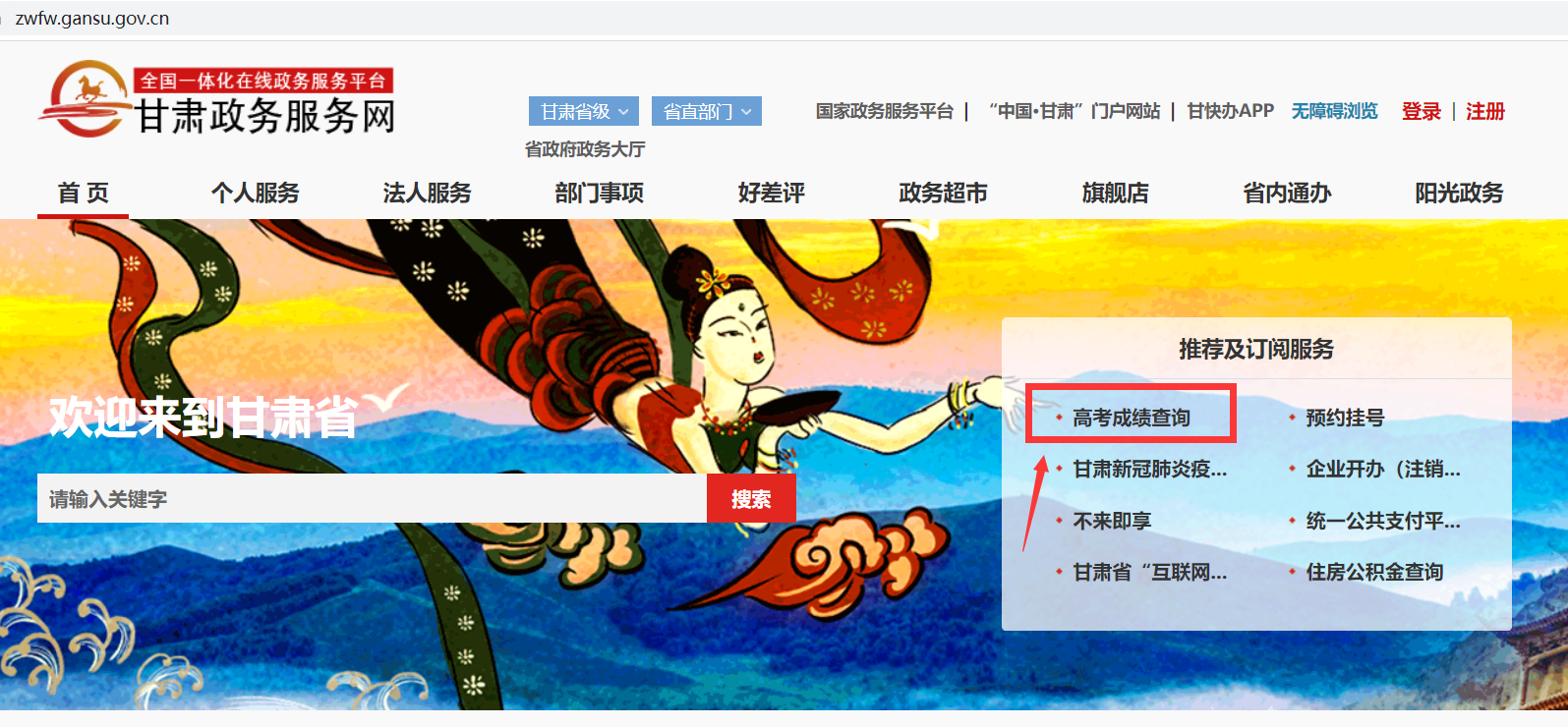 打開“甘肅政務(wù)服務(wù)網(wǎng)”https://zwfw.gansu.gov.cn/,在首頁“推薦及訂閱服務(wù)”欄目,點擊“高考成績查詢”進入查詢頁面,輸入考生號、身份證號即可查詢。