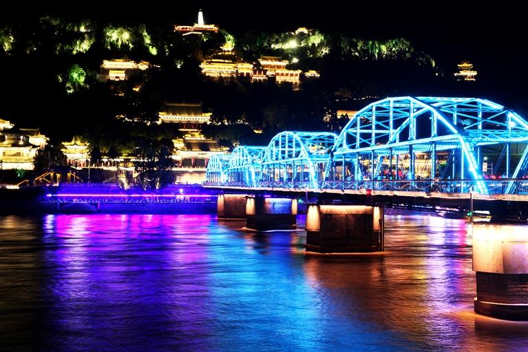 中國甘肅網(wǎng)5月24日訊 據(jù)蘭州日報報道記者 張建平 攝)為迎接甘肅省第十四次黨代會勝利召開,我市在標(biāo)志性橋梁、廣場及樓體精心組織以“蘭州藍(lán)”為主題的燈光秀,營造濃厚的喜慶氛圍。中山橋、黃河樓等處燈光展示“蘭州藍(lán)”,這顯示了全市上下守護(hù)碧水藍(lán)天的信心,更昭示著全市黨員干部堅定垂范清廉蘭州,共建政治生態(tài)“蘭州藍(lán)”的決心。