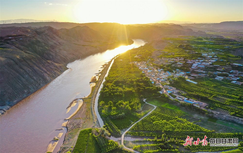 夏日,夕陽(yáng)西下,黃河在景泰五佛鄉(xiāng)境內(nèi)的車(chē)木峽繞了個(gè)大大的彎,位于黃河峽谷中的 車(chē)木峽山村高山環(huán)繞,周?chē)浅善臉?shù)林,廣袤的田野閃耀著瑰麗的色彩,靜靜地躺在綠色的懷抱之中。