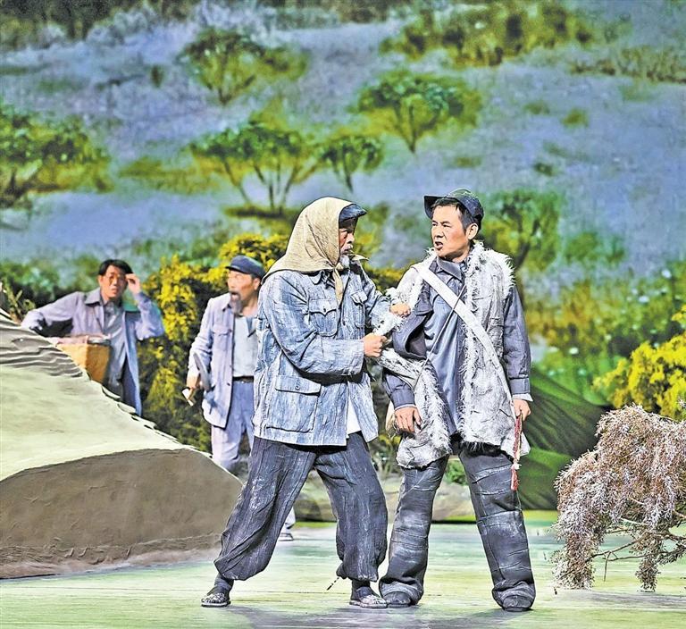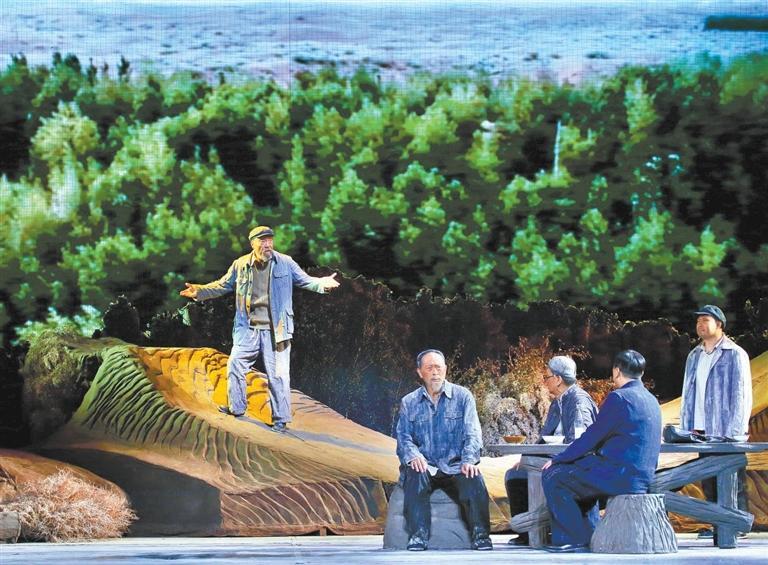 現(xiàn)實題材是話劇藝術(shù)的寵兒,在話劇進(jìn)入中國一百多年的時光中,現(xiàn)實題材創(chuàng)作占據(jù)相當(dāng)大的比例。在近當(dāng)代中國歷史的進(jìn)程中,話劇始終起著敢為天下先、針砭時弊的作用,但話劇又有其極其特殊的藝術(shù)框范。人們在觀看話劇時,仿佛就是在觀看自己的人生,觀看自己和身邊最熟悉的人們,這是話劇藝術(shù)獨具的極高的審美要求。尤其是現(xiàn)代題材的創(chuàng)作,稍有不慎便會陷入同質(zhì)化的僵硬模式,使舞臺藝術(shù)失去應(yīng)有的美感。話劇《八步沙》讓6個老漢成為舞臺聚光燈下的主角,體現(xiàn)了創(chuàng)作者們呼應(yīng)時代之需,為最普通的農(nóng)民寫生立傳的拳拳之心。6個老農(nóng)民談不上人們通常意識中的“美”,“治沙”這樣的故事也相對比較單調(diào),不大容易出彩,而創(chuàng)作者們以八步沙這個真實的地名作為劇名,以“六老漢”治沙這個真實的事件作為全劇的敘述內(nèi)容,卻能宕開一筆把特定的外部環(huán)境與人物的內(nèi)心世界巧妙地融為一體,為全劇注入了濃郁飽滿的戲劇情境和情感,使這部話劇有了獨屬于自己的一份力度、一份無法替代的光彩。全劇的情節(jié)一曲三折,以小見大,當(dāng)黑壓壓的沙塵暴鋪天而來的時候,當(dāng)六老漢在嚴(yán)酷的環(huán)境中吃盡苦頭,摸索出“一棵樹,一把草,壓住沙子防風(fēng)掏”的寶貴經(jīng)驗,使漫無邊際的沙漠終于出現(xiàn)一抹綠色,繼而眼看著一棵又一棵綠樹成活成林,終于成為一片綠洲的時候,我相信觀眾的心也被藝術(shù)琴弦撥動,始終被劇情牽著走,為劇中人物的命運(yùn)擔(dān)心、懸心、痛心、開心,從中深深地感受到劇中所蘊(yùn)藏的豐富內(nèi)涵和它所傳達(dá)出的真切意趣。
