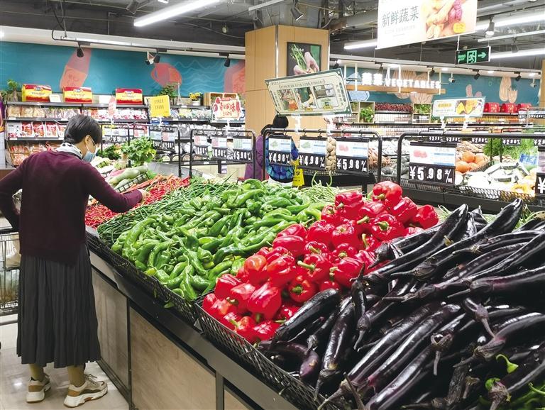 超市蔬菜、水果和肉蛋類供應(yīng)正常儲備充足。 蔣凌 攝