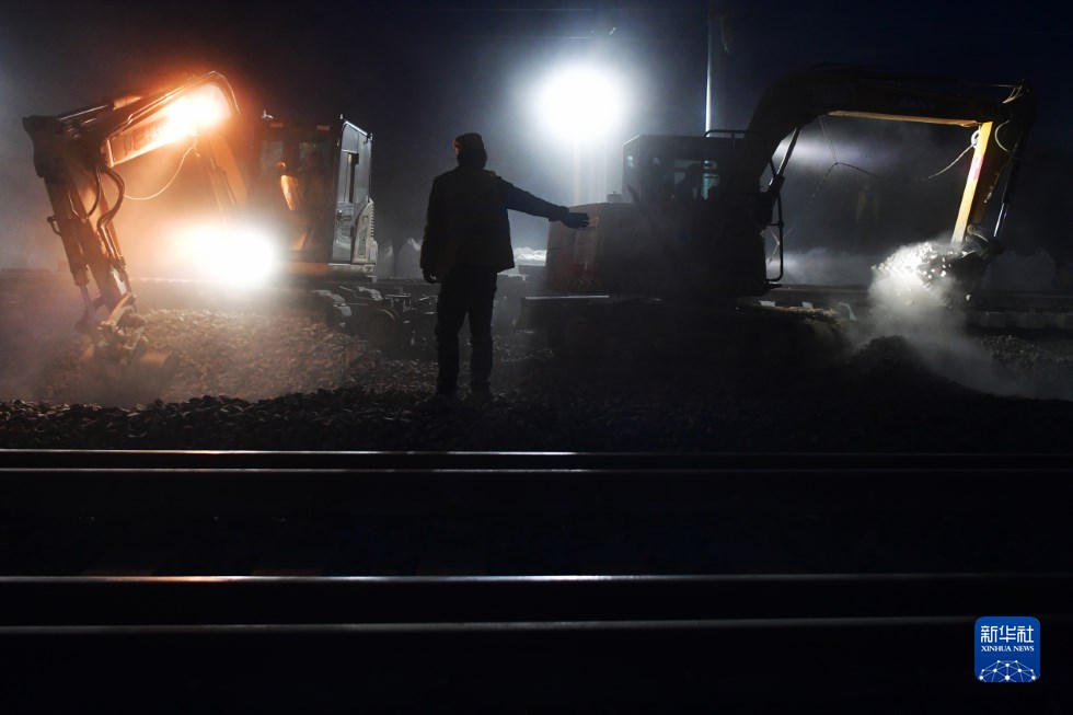 中鐵十一局建設(shè)者在中蘭客專(zhuān)(甘肅段)接入中川城際鐵路道岔插鋪施工現(xiàn)場(chǎng)作業(yè)(4月26日攝)。新華社記者 陳斌 攝