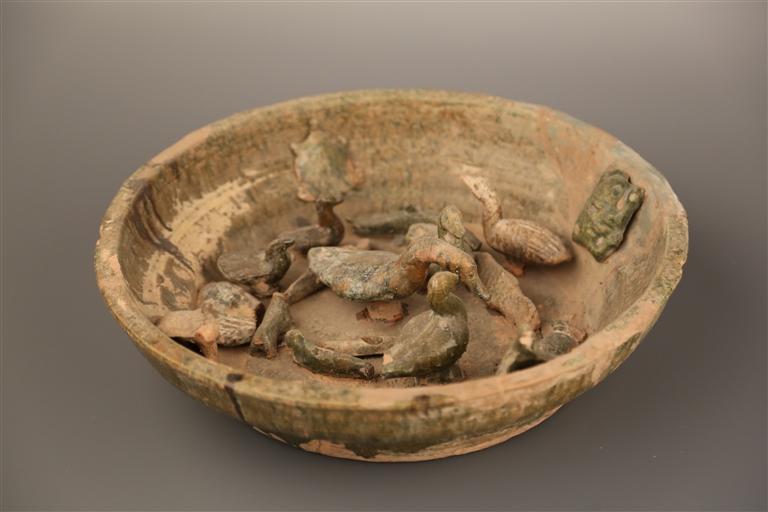 綠釉陶陂池高15厘米,口32厘米,底16厘米,為蘭州市博物館館藏三級文物。陶陂池內(nèi)有形象生動(dòng)的鴨、鵝、龜、青蛙等造型,代表墓主人生前擁有這樣一份家產(chǎn)。陂池,指在自然坡地筑堤蓄水澆灌農(nóng)田的池塘、澤沼。我國興修陂池的歷史很早,傳說夏禹治水時(shí),曾從事“陂九澤”的工程。利用地勢蓄水灌溉,在古代較為普遍,尤其在漢代時(shí)陂池工程得到較大發(fā)展。陂池養(yǎng)魚、家禽、種藕、種菱角、養(yǎng)龜,不僅可提高農(nóng)民的經(jīng)濟(jì)收入,豐富人們的食物來源,還可以起到美化環(huán)境、凈化水質(zhì)的作用,青蛙、田螺自由生存,起到平衡自然生態(tài)的作用。