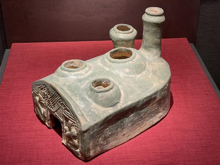 綠釉陶灶高21厘米,長28厘米,寬19.5厘米,為蘭州市博物館館藏二級文物。陶灶反映了當(dāng)時(shí)人們的生產(chǎn)生活和思想觀念。漢代之所以流行陶灶模型,主要原因有二,一是兩漢時(shí)期大土地所有制經(jīng)濟(jì)的盛行使得豪門貴族占據(jù)社會(huì)主要地位,而“事死如事生”的觀念促使他們隨葬大量明器,以求在陰間繼續(xù)享受榮華富貴。二是由于漢代的祭灶思想助推了陶灶的流行。