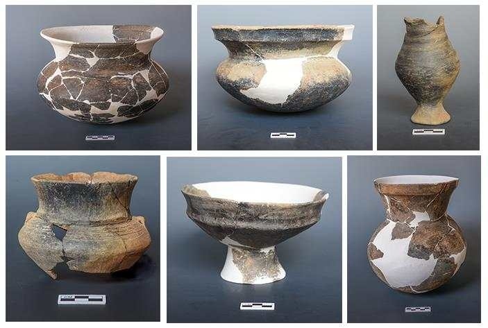 古城村遺址面積約4.2萬(wàn)平方米,現(xiàn)存的貝丘堆積最厚處達(dá)6.5米,由大量尾部被敲破的螺螄殼與灰土層交替堆疊形成。碳十四測(cè)定年代為距今3600至2500年,約相當(dāng)于中原地區(qū)的商代至兩周時(shí)期。商代遺存可分為早晚兩段,早段發(fā)現(xiàn)保存完整的橢圓形環(huán)壕聚落,由中心臺(tái)地、外圍環(huán)壕和護(hù)坡組成,中心臺(tái)地面積約27000平方米,環(huán)壕和護(hù)坡周長(zhǎng)約600米,這種聚落格局一直延續(xù)至兩周時(shí)期。商代晚段發(fā)現(xiàn)一批土坑墓和甕棺葬。兩周時(shí)期的遺存以房址、螺殼堆、灰燼、活動(dòng)面等居住類(lèi)遺跡為主,房址多為方形半地穴式。出土青銅器、陶器、玉器、石器、骨器、木器等文物4000余件。