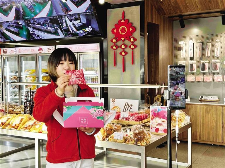 “第一次走進(jìn)直播間的粉絲一定要入手玫瑰禮餅,它是采用蘭州苦水玫瑰制作的……”每天上午,位于九州中路的愛(ài)禮烘焙生活工廠(chǎng)店內(nèi)一角,工作人員都在直播售貨。剛走進(jìn)店里就能聞到撲鼻而來(lái)的糕點(diǎn)香味,琳瑯滿(mǎn)目的商品讓人應(yīng)接不暇。