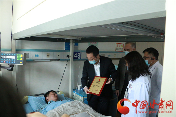 甘肅省紅十字會(huì)黨組書(shū)記、專(zhuān)職副會(huì)長(zhǎng)楊芳勝為甘肅省第54例造血干細(xì)胞捐獻(xiàn)者龔先生頒發(fā)“博愛(ài)金獎(jiǎng)”和榮譽(yù)證書(shū)