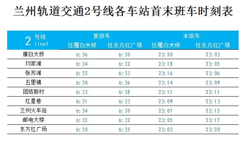 另?yè)?jù)了解,蘭州軌道交通2號(hào)線一期工程初期運(yùn)營(yíng)時(shí)間為6:30至23:20,每天運(yùn)營(yíng)服務(wù)16小時(shí)50分鐘,運(yùn)行列車(chē)最小行車(chē)間隔6分20秒,最大行車(chē)間隔8分40秒,全線單程運(yùn)行平均時(shí)間約15分鐘53秒。