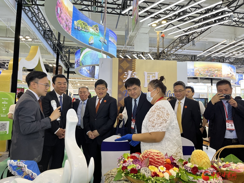 泰國國家館展覽面積300平方米,由泰國駐西安總領(lǐng)事館牽頭組織參展,展區(qū)設(shè)計采用白金色為主色調(diào),簡潔明亮,富有泰國特色。主要展示泰國特色文化、企業(yè)和產(chǎn)品。展館整體劃分為接待區(qū)、洽談區(qū)、舞臺表演互動區(qū)、泰國雕刻體驗區(qū)、泰式按摩體驗區(qū)、模擬泰國旅游景點拍照區(qū)及產(chǎn)品展示區(qū)等,通過造型、多媒體、圖片及表演等形式,以Food 美食、Fighting 泰拳、Film 電影、Fashion 時尚和 Festival 節(jié)日等多元素,全面展示泰國文化的多元、包容、開放與創(chuàng)新的特點。參展企業(yè)共22家,主要展品涵蓋食品、化妝品、居家用品及保健按摩產(chǎn)品等。