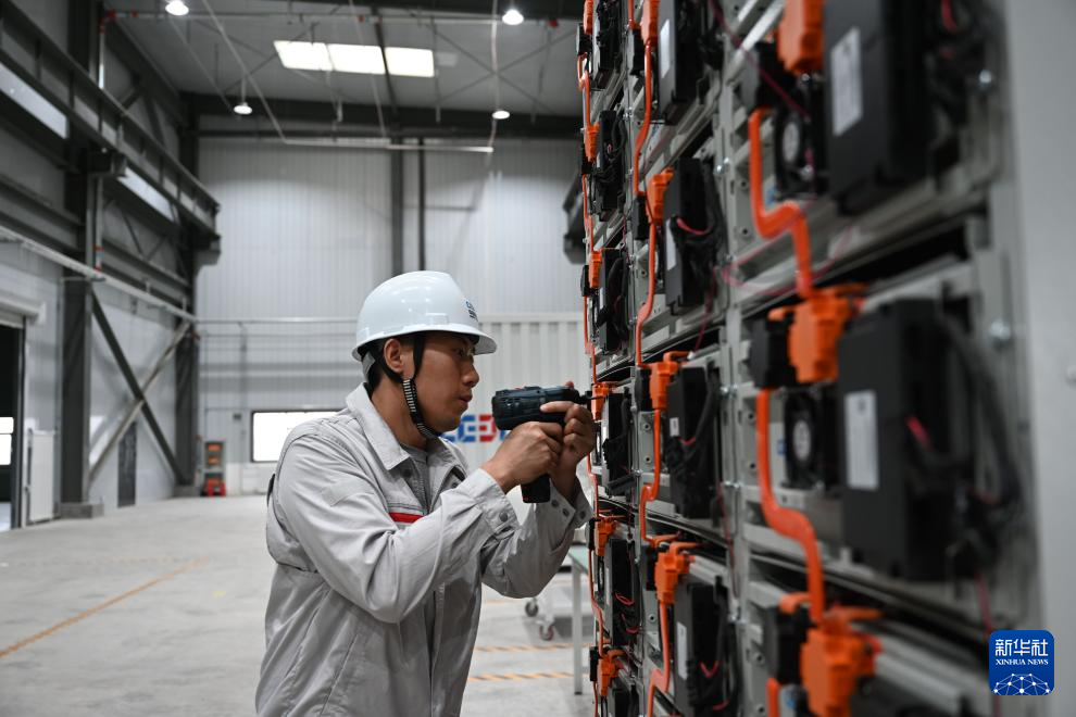 8月10日,工人在葛洲壩(甘肅)能源科技有限公司組裝電化學(xué)儲(chǔ)能裝置。新華社記者 金良快 攝