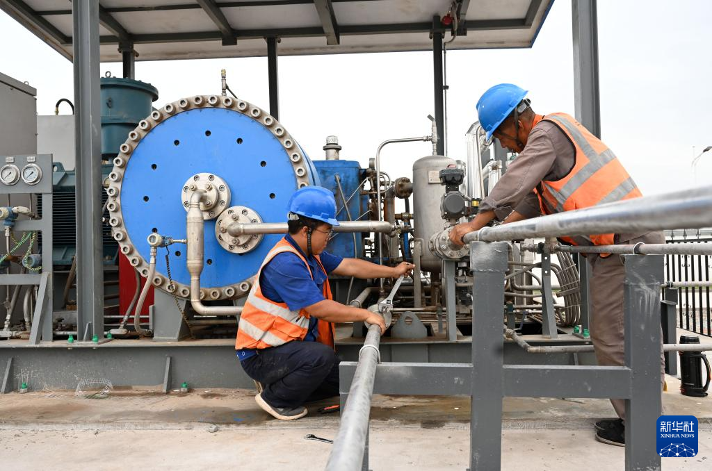8月10日,工人在中國能建張掖氫能綜合應(yīng)用示范項(xiàng)目調(diào)試氫氣加壓裝置。新華社記者 金良快 攝