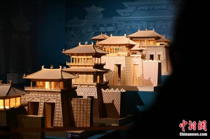 《千年?duì)I造——敦煌壁畫中的建筑之美》特展上的古代建筑模型。該模型的“單門道花磚城門”來(lái)源于莫高窟第159窟。李亞龍 攝