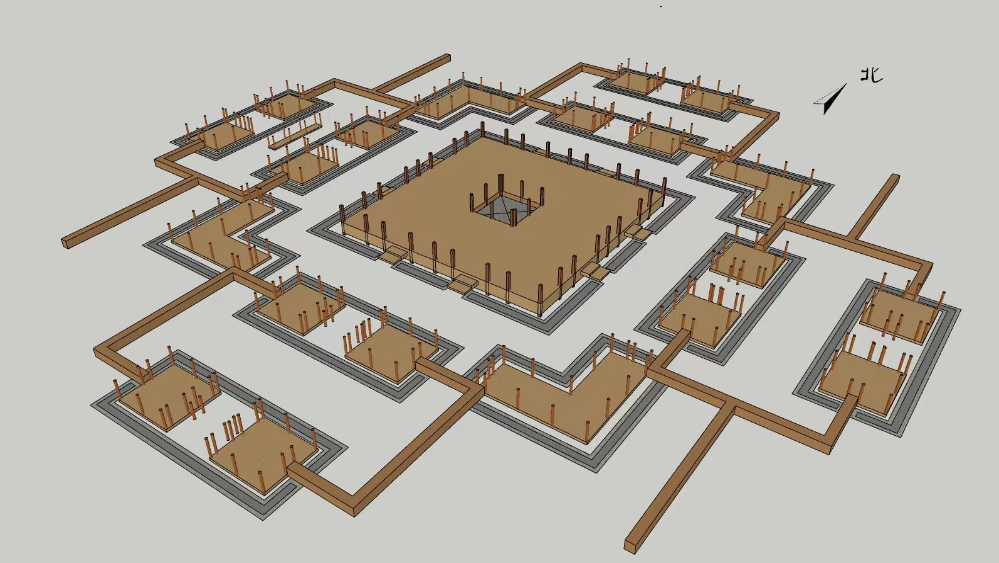 四角坪遺址考古隊領(lǐng)隊、甘肅省文物考古研究所副研究館員侯紅偉介紹,四角坪遺址已發(fā)掘部分主要由中部大型方形夯土臺基、四周的附屬建筑以及四角曲尺形附屬建筑組成,整個建筑群層級分明、秩序井然。整體呈現(xiàn)出以中部大型夯土臺基為中心的對稱格局??脊湃藛T通過解剖土層發(fā)現(xiàn),整個臺基由34層夯土夯筑而成,每層厚7至8厘米。