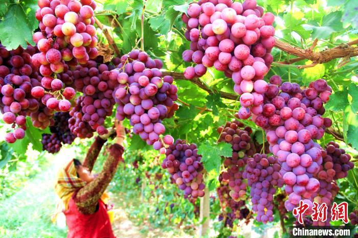 敦煌市莫高鎮(zhèn)農(nóng)民在采摘葡萄。(資料圖)張曉亮 攝