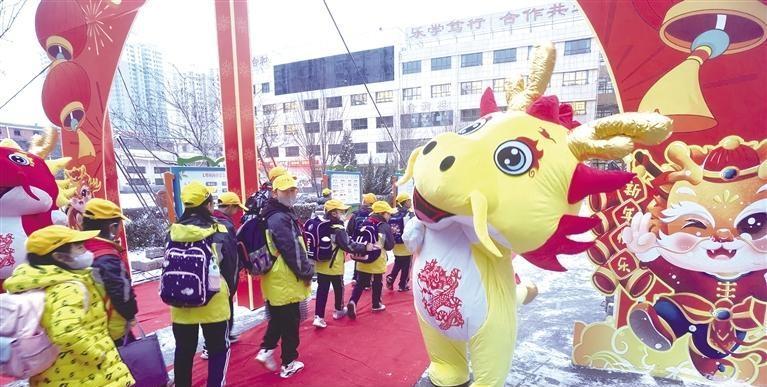 當(dāng)日上午7時(shí)許,記者在蘭州市東郊學(xué)校看到,校門內(nèi)兩邊擺放著兩條由數(shù)百個(gè)氣球組成的長龍。高年級段和低年級段的學(xué)生要穿越寫著“龍騰虎躍,前程似錦”的龍門,方可進(jìn)入教室。同時(shí),兩邊的老師,給每一位到校的學(xué)生發(fā)放小禮物。記者注意到,每個(gè)孩子都領(lǐng)到了一個(gè)小盲盒,里面裝著不同的文具。孩子們高興地?fù)]舞著手中的盲盒,展示新春的快樂。