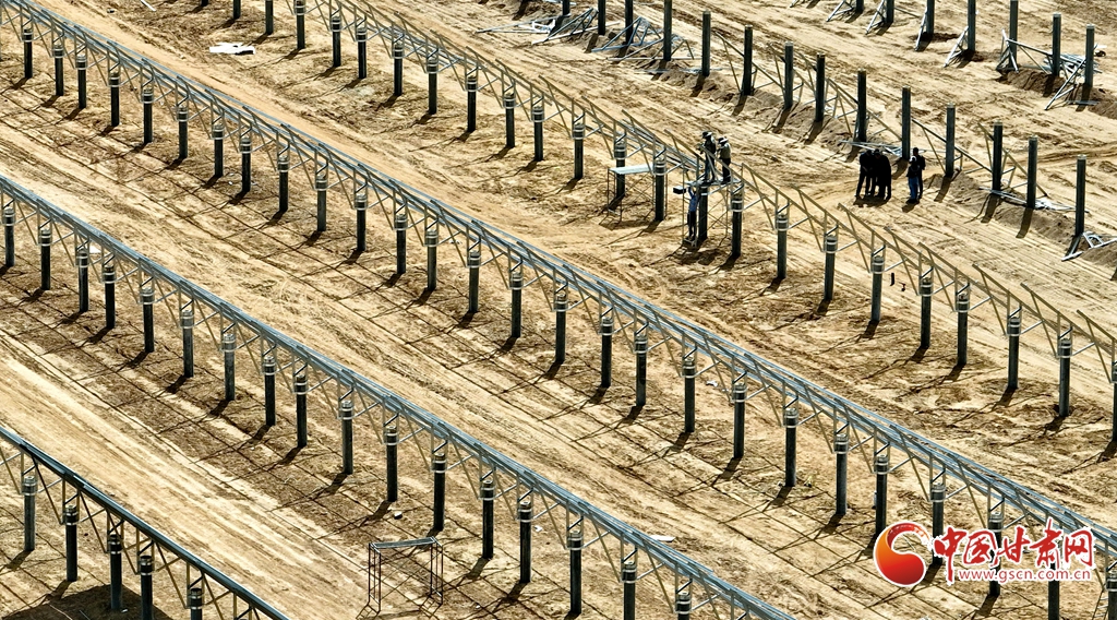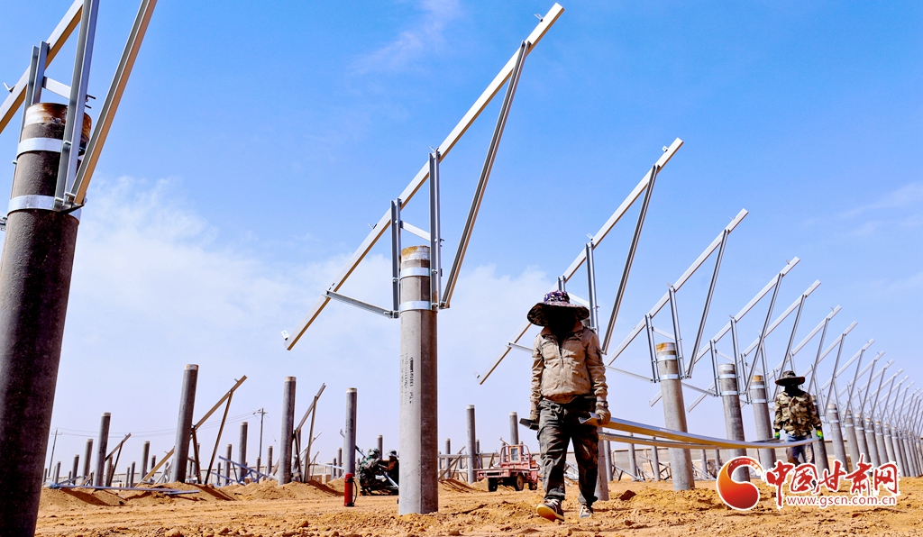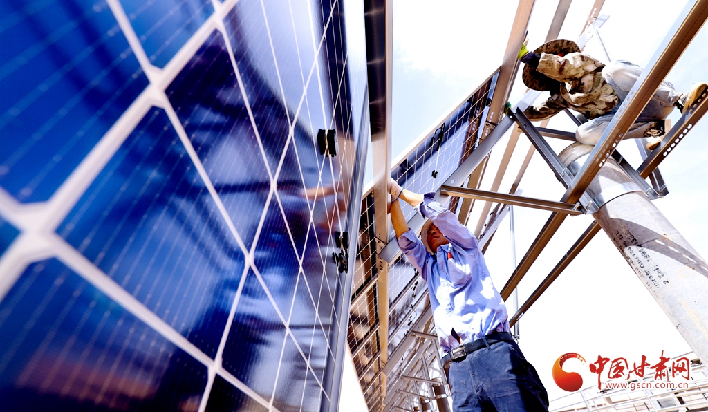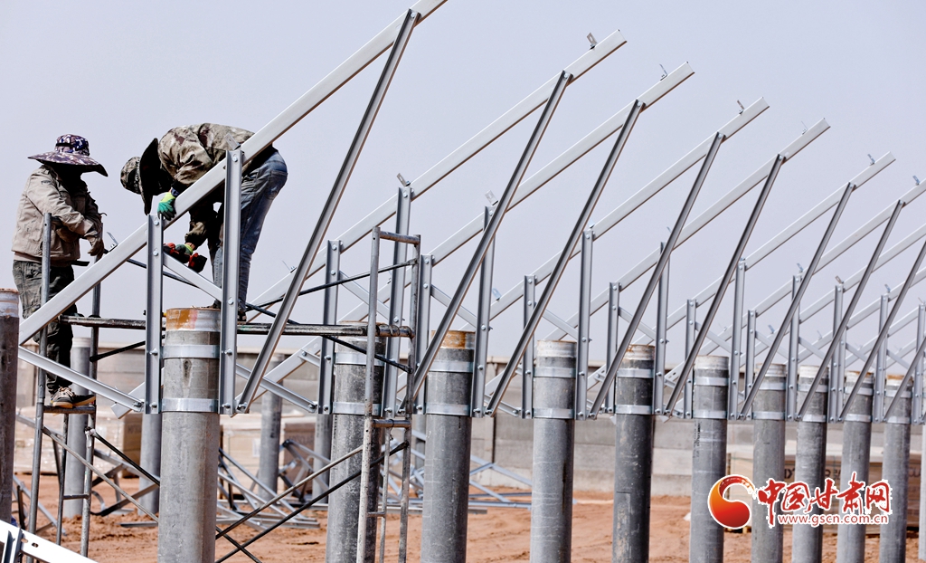 4月15日,甘肅省張掖市臨澤縣板橋鎮(zhèn)一養(yǎng)殖場工地上,工程建設者們正在安裝光伏板。