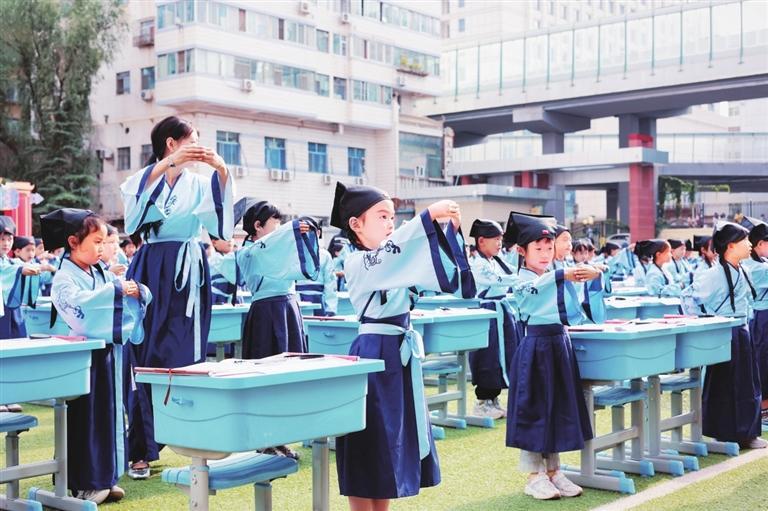 中國(guó)甘肅網(wǎng)9月2日訊 據(jù)蘭州晨報(bào)報(bào)道(奔流新聞·蘭州晨報(bào)記者裴強(qiáng)) 8月30日,蘭州市七里河教育集團(tuán)為七里河小學(xué)和中車分校的600名一年級(jí)新生舉行入學(xué)“開(kāi)筆禮”儀式。開(kāi)筆禮在中國(guó)傳統(tǒng)文化中是對(duì)少兒識(shí)字習(xí)禮的稱謂,是標(biāo)志少兒進(jìn)入學(xué)習(xí)階段的重要紀(jì)念,是中國(guó)古代人生的首次大禮,孩子將要入學(xué)讀書(shū)寫字、習(xí)禮之時(shí)的一個(gè)傳統(tǒng)禮節(jié)。兩所學(xué)校600名一年級(jí)新生“端正衣冠”“感恩先賢”“朱砂啟智”“擊鼓鳴志”“啟蒙描紅”,體驗(yàn)傳統(tǒng)“開(kāi)筆禮”儀式。