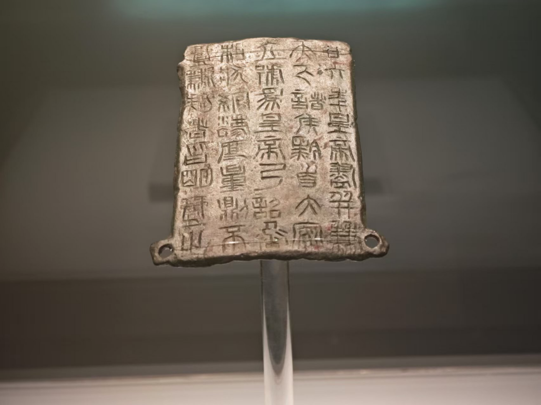 “鎮(zhèn)原縣博物館的鎮(zhèn)館之寶是秦二十六年銅詔版,1976年 4月 1日被鎮(zhèn)原縣城關鎮(zhèn)富坪村建宅取土的農民發(fā)現并上交。在1996年 9月,國家文物局鑒定專家組定為國家一級文物。這塊銅詔版上有文字5 行,共40字,字跡清晰,線條纖細,字體為小篆。在用筆結構上既有秦代小篆規(guī)矩整飭的風范,又保留著大篆文字的某些特點。”鎮(zhèn)遠縣博物館講解員介紹道。