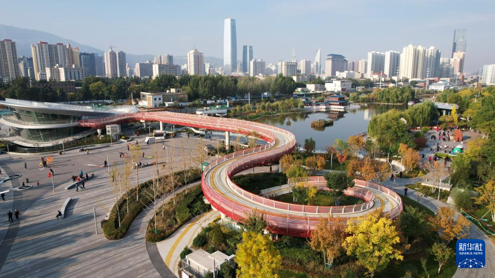 這是位于蘭州市城關(guān)區(qū)黃河岸邊的雁灘公園(10月17日攝,無人機照片)。新華社記者陳斌攝