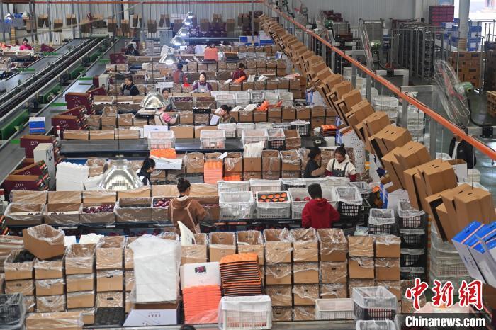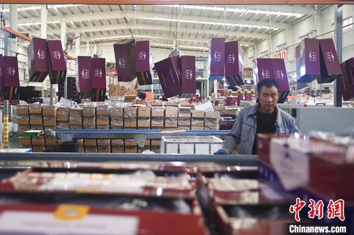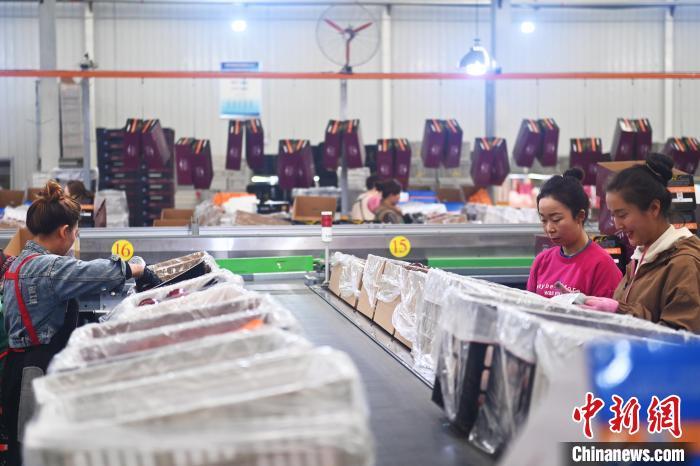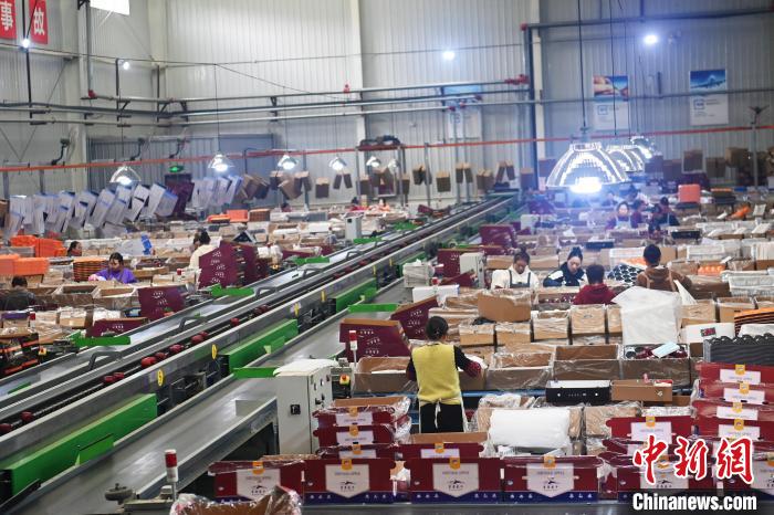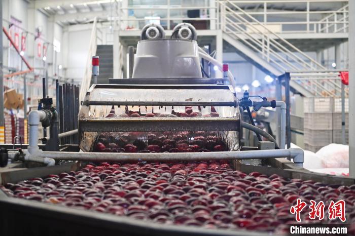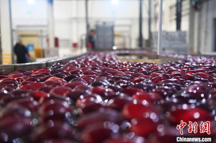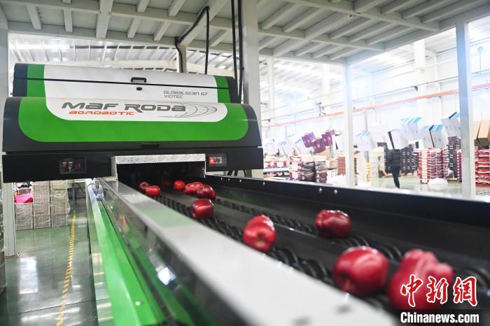 10月21日,在甘肅省天水市秦安縣雪原果品有限公司加工車間,蘋果自動(dòng)化分揀線上工作人員進(jìn)行分揀工作。該生產(chǎn)線每天能處理30噸蘋果,蘋果經(jīng)過設(shè)備水洗、烘干、稱重等環(huán)節(jié),進(jìn)入不同等次的包裝線,工人們?cè)賹?duì)每顆蘋果進(jìn)行復(fù)檢、貼標(biāo),分裝在不同規(guī)格的包裝箱中。甘肅秦安蘋果總面積61.37萬畝,產(chǎn)量86.8萬噸,產(chǎn)值55.6億元人民幣,先后從國內(nèi)科研院所引進(jìn)青砧、M26、ZH5等抗重茬蘋果矮化砧木6個(gè),配合國家蘋果產(chǎn)業(yè)技術(shù)體系,引進(jìn)長富2號(hào)、煙富6號(hào)、煙富8號(hào)、瑞香紅等蘋果新品種12個(gè)。中新社記者李亞龍攝