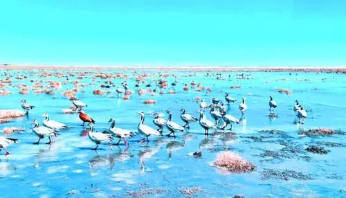 天氣晴朗時(shí),佇立湖邊的山崗上俯瞰湖心,好似一塊無瑕的翡翠。如果你來到這里,可飽覽遠(yuǎn)處草原的天空深邃如井,云如裙裾;近處的湖面上,鳥飛魚躍,這些美景定會(huì)讓你流連忘返。