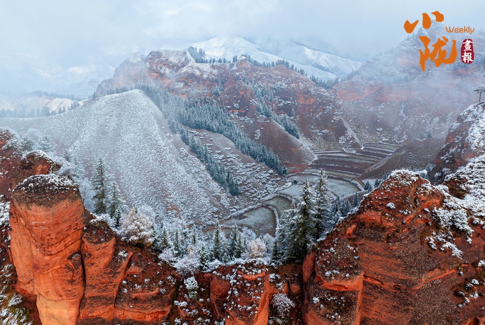 如斧劈刀削的赤壁,被冬雪溫柔地描摹,無(wú)垠的丹霞赤紅與素潔的白雪同框,赭紅似血、潔白如絮,在大地上展開一幅對(duì)比強(qiáng)烈又和諧共存的絢麗畫卷。