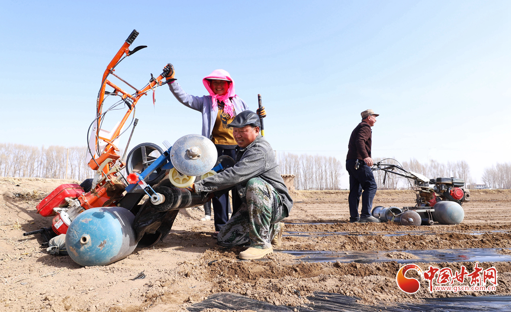 農戶們正操作小型專用覆膜機覆膜保墑