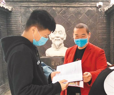 3月24日,山東省淄博市蒲松齡紀(jì)念館復(fù)工。圖為工作人員向第一批游客贈(zèng)書(shū)。 曹檸薇攝